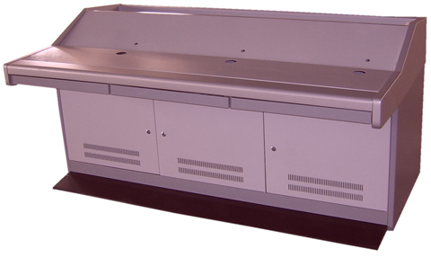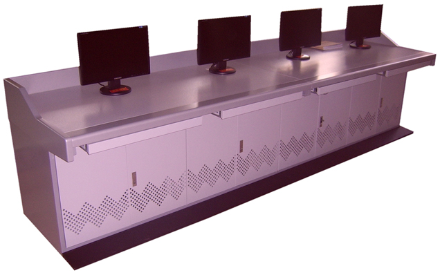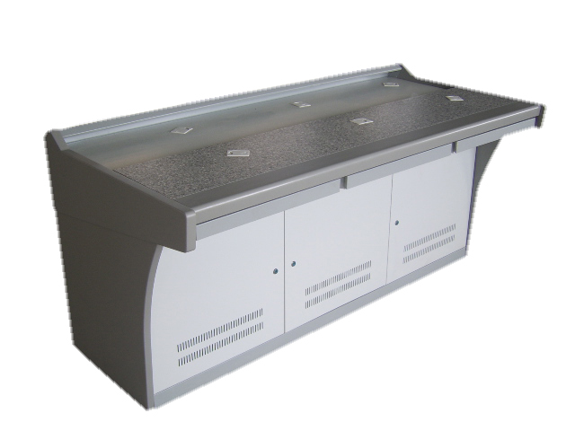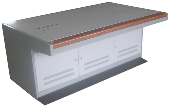多媒体操作台的特点及性能: 1、操作台设计严格遵循人体工程学。 2、整体外观流线造型,简洁、流畅、现代、美观大方。 3、各部位尺寸均依据人体工程学经过精确计算,所有角、边均设计为弧线过渡,既保证操作安全、舒适又方便操作。 4、操作台内均按国际电工标准安装,具有较强的通用性。 5、操作台内各单元互相贯通,走线方便,显示器有凹槽固定,走线隐避,美观大方,同时装有扎线条,保证布丝整洁有序。 6、操作台顶部和后部均开有散热孔,并附装防尘网,既有很好的通风散热条件,又有防尘功能。防尘网可轻松取下,方便定期清洗。 7、操作台设计为拼装结构,可单个使用,亦可多个拼接,运输方便,强度可靠。 8、侧板为木制材料,台面板为防火胶板,其余均为优质冷轧钢板。 9、表面处理:去油、磷化、电泳底漆、静电纳米塑粉。